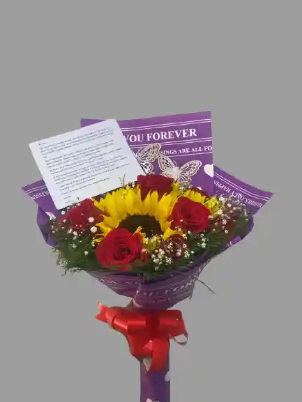bouquet, ramo, ramillete o bucho de girasol y rosas rojas de excelente calidad, decoracion de lacasa, papel koreano, yibso, trifer, moñito, mariposas, tarjeta personalizada, domicilio
