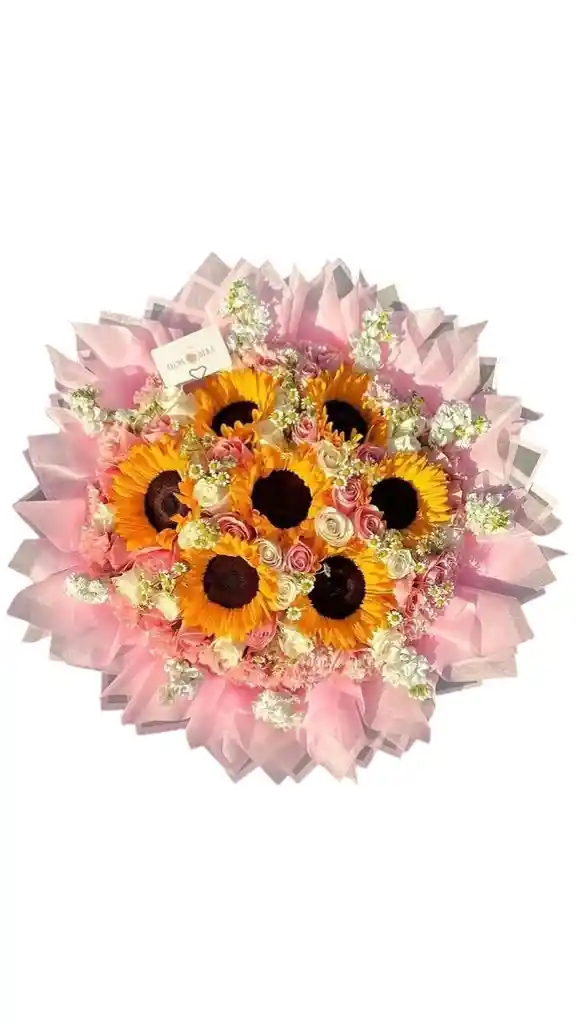 es una pieza monumental que fusiona la energía radiante del sol con la delicadeza más romántica. El diseño destaca por un corazón central de girasoles majestuosos rodeados por una densa corona de rosas en tonos rosa pastel y blanco, complementados con detalles de flores silvestres que aportan una textura rica y exuberante.