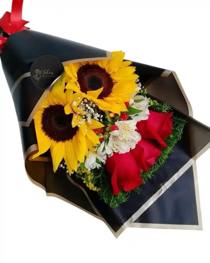 BOUQUET DE REGALO CON GIRASOLES ROSA, ASTROMELIAS, FOLLAJE, PAPEL DECORATIVO, MOÑO, TARJETA PERSONALIZADA .