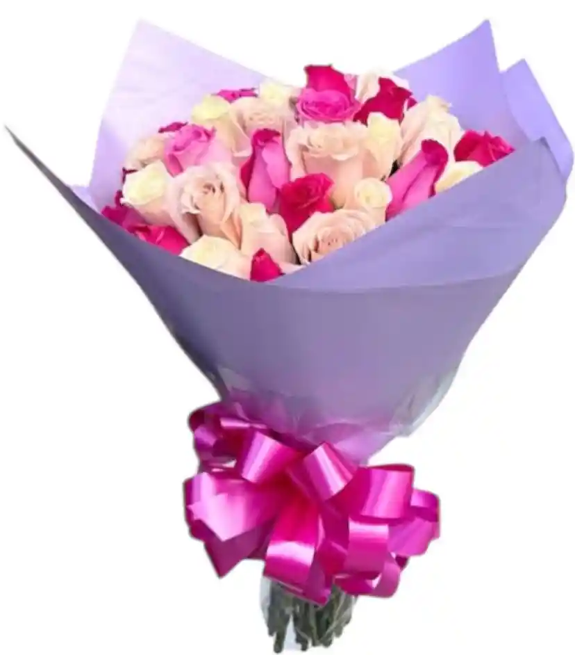 BOQUET CON 50 ROSAS SURTIDAS , PAPEL DECORATIVO , MOÑO , TARJETA PERSONALIZADA .