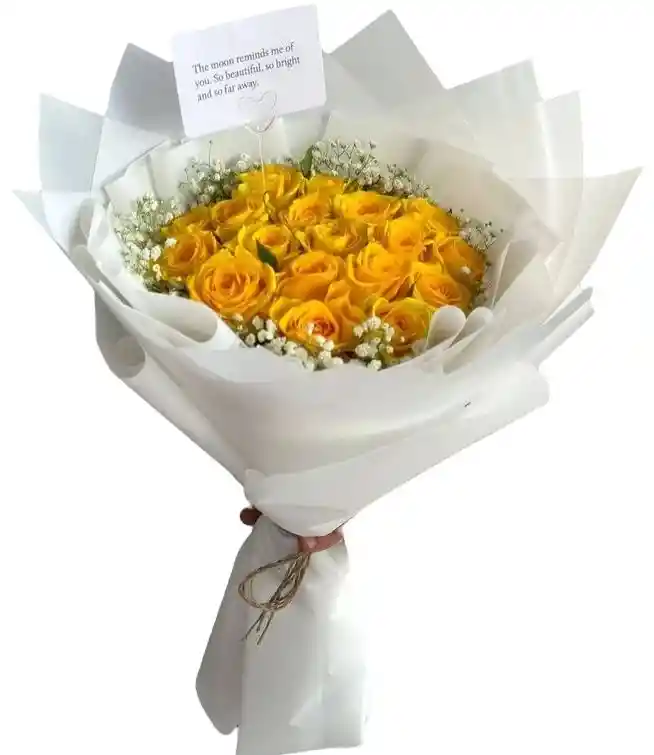 BOUQUET CON 24 ROSAS AMARILLAS , PERLA , MOÑO , PAPEL DECORATIVO , TARJETA PEROSONALIZADA