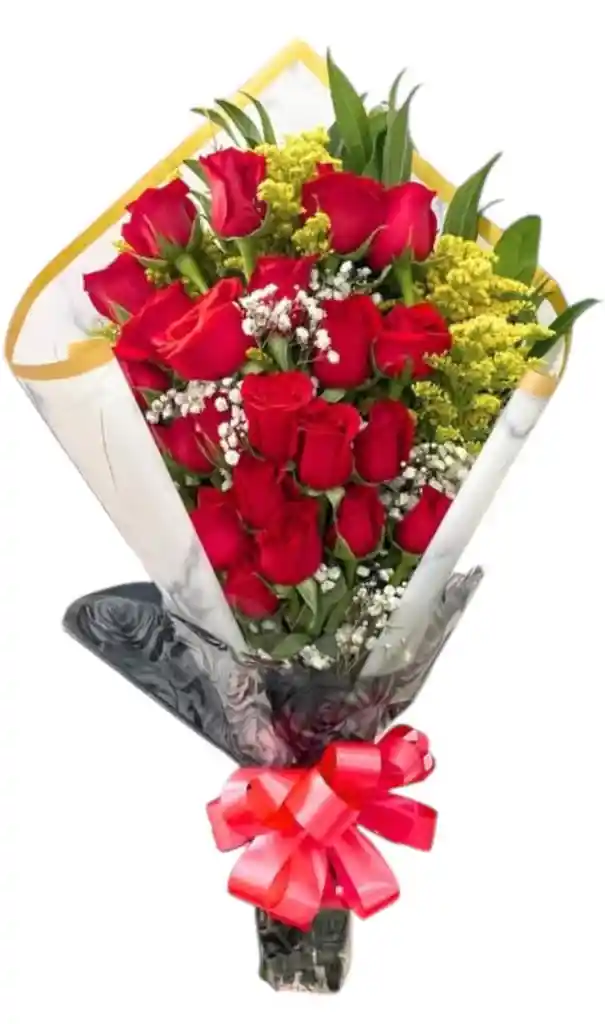 BOUQUET ALARGADO CON 24 ROSAS , FOLLAJE , MOÑO , PAPEL DECORATIVO , TERJETA PERSONALIZADA