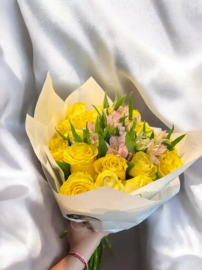Bouquet con aprox. 24 rosas amarillas con 1 paquete de astromelia. Nota: La flor puede ser sustituida dependiendo la disponibilidad de color y del producto “Mensaje Personalizado” máximo de 30 caracteres (Dejar el mensaje en el chat, los comentarios no se previsualizan para la tienda por lo que si se dejan allí no podrá ser incluido).