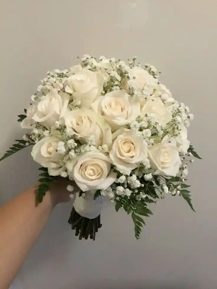 Bouquet de 24 rosas blancas con gypsophila Nota: La flor puede ser sustituida dependiendo la disponibilidad de color y del producto “Mensaje Personalizado” máximo de 30 caracteres (Dejar el mensaje en el chat, los comentarios no se previsualizan para la tienda por lo que si se dejan allí no podrá ser incluido).