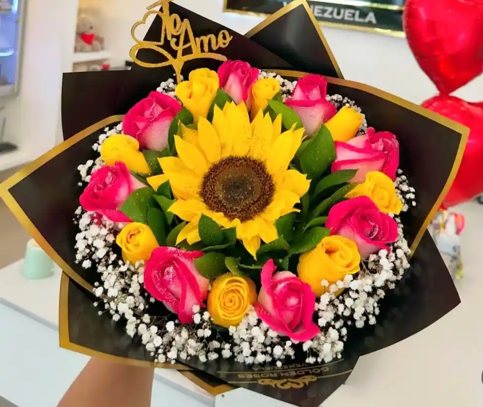 Bouquet en rosas surtidas con girasol envoltura papel coreano