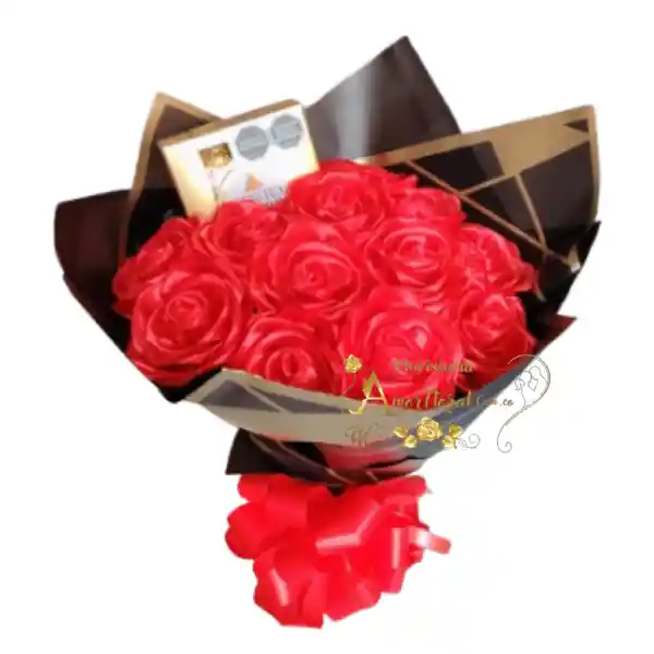 bouquet por 12 rosas eternas, chocolates ferrero por 4 unidades, si deseas un mensaje para la tarjeta lo puedes dejar escrito en el área de observaciones o escribirnos al whatsapp al 3143111616 y enviarnos el mensaje para la tarjeta.