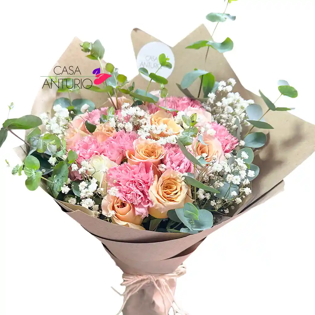 Bouquet de 12 rosas frescas acompañadas de eucalipto aromático, delicada perla decorativa y variedad de follajes, envueltas en papel kraft que resalta su belleza rústica y elegante. Un detalle lleno de encanto ideal para cualquier ocasión.