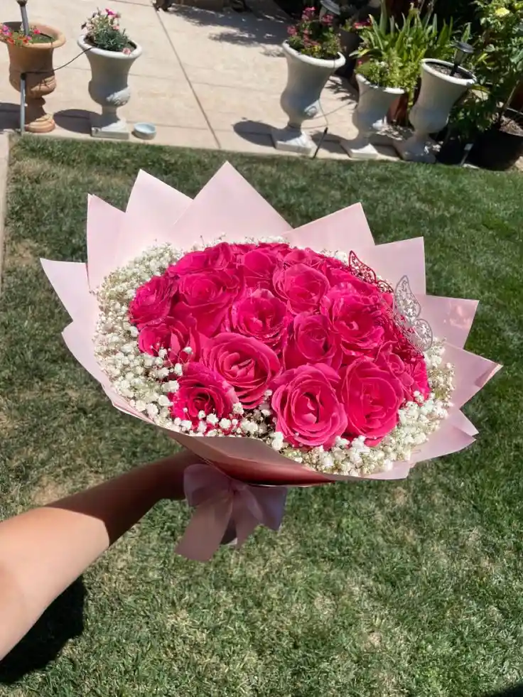 Hermoso bouquet de vibrantes rosas fucsias acompañado de fresco follaje que resalta su color intenso y elegante. Un arreglo perfecto para regalar y llenar de alegría cualquier ocasión especial.