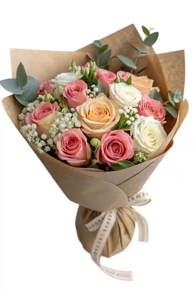 Bouquet estilo boutique que mezcla rosas crema, durazno y rosa con follaje de eucalipto, envuelto en papel kraft para un look elegante y natural.