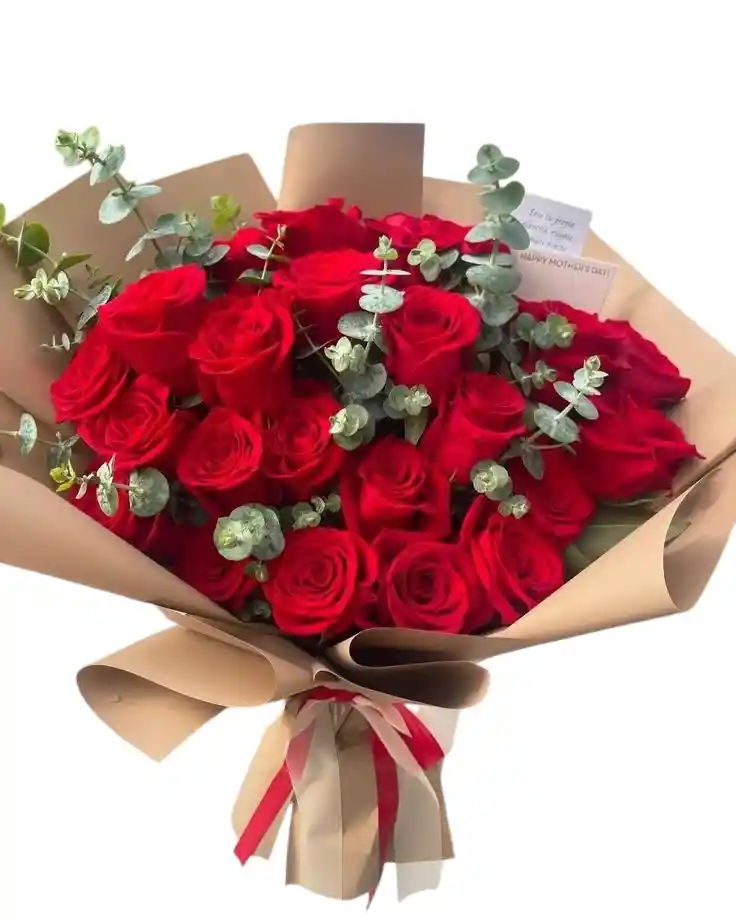 es una pieza de diseño floral que equilibra perfectamente la fuerza del color con la frescura de la naturaleza. El arreglo destaca por una selección de rosas rojas de calidad premium, elegidas por su tono vibrante y textura aterciopelada, que se entrelazan con abundantes ramas de eucalipto para brindar un aroma relajante y un contraste verde orgánico muy moderno.