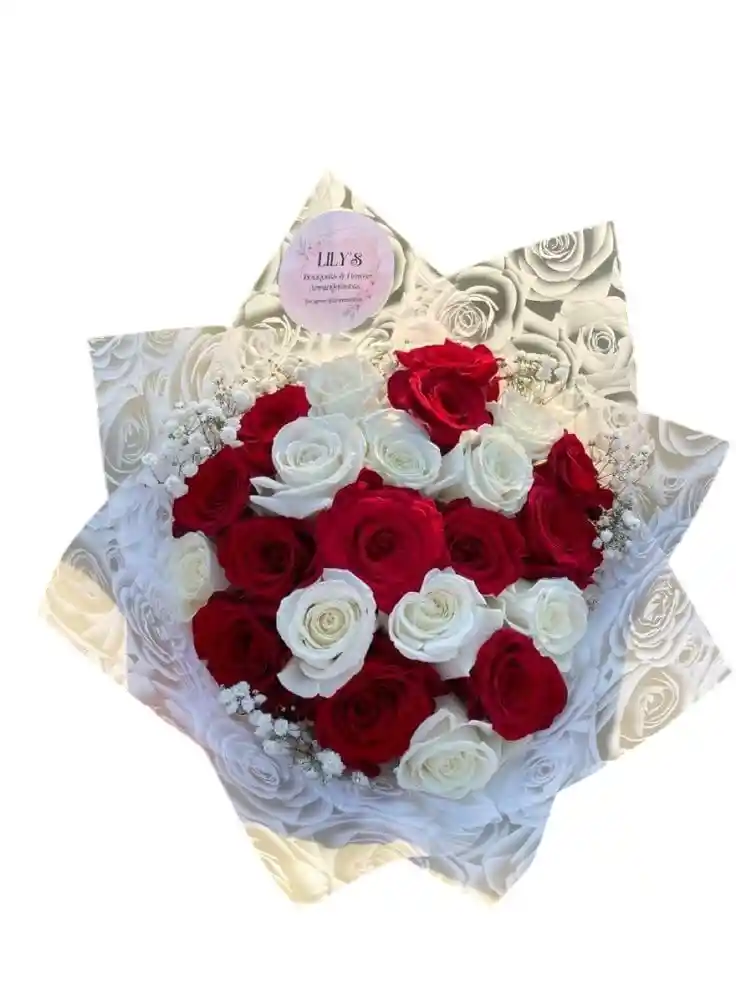 es una composición equilibrada y elegante que combina la fuerza del amor con la ternura de la amistad. El arreglo presenta una mezcla perfecta de rosas rojas intensas y rosas blancas puras, acentuadas por delicadas flores de gipsofila que añaden una textura ligera y romántica.