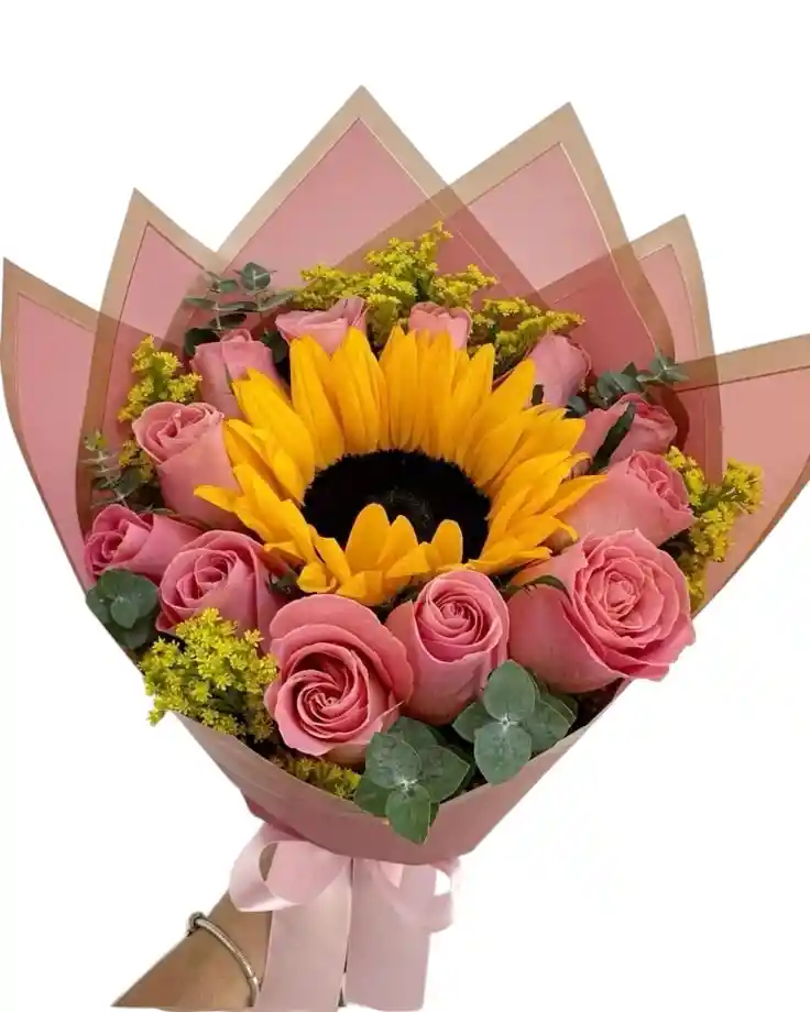 Hermoso bouquet de 12 rosas fucsias con un girasol en el medio, con follajes de eucalipto y soleago, regala este hermoso arreglo floral ideal para impresionar a es persona ideal