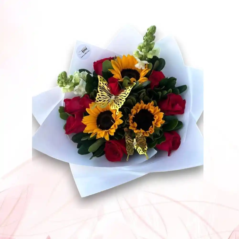 Bouquet elaborado con rosas frescas y girasoles vibrantes, acompañado de follaje natural y envuelto en papel premium. Un arreglo lleno de color y significado, ideal para cumpleaños, aniversarios, agradecimientos o para sorprender con un detalle especial.