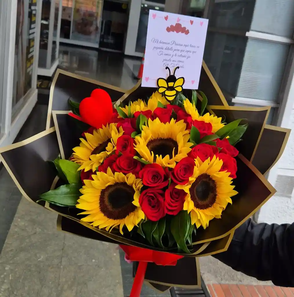 Bouquet redondo compuesto por 6 tallos de girasoles y 24 botones de rosas (color puede variar según disponibilidad), acompañado de diferentes follajes papeles decorativos y moño .