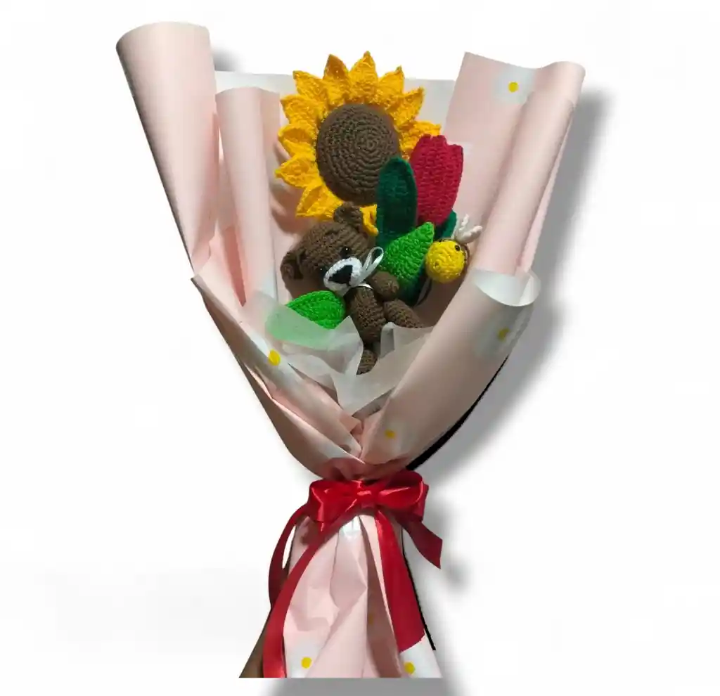 Bouquet de un girasol oso y tulipan mini abeja en crochet .