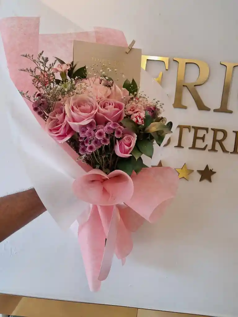 6 rosas, 1 rusco, 1 gipsofilia, mini claveles, mensaje personalizado