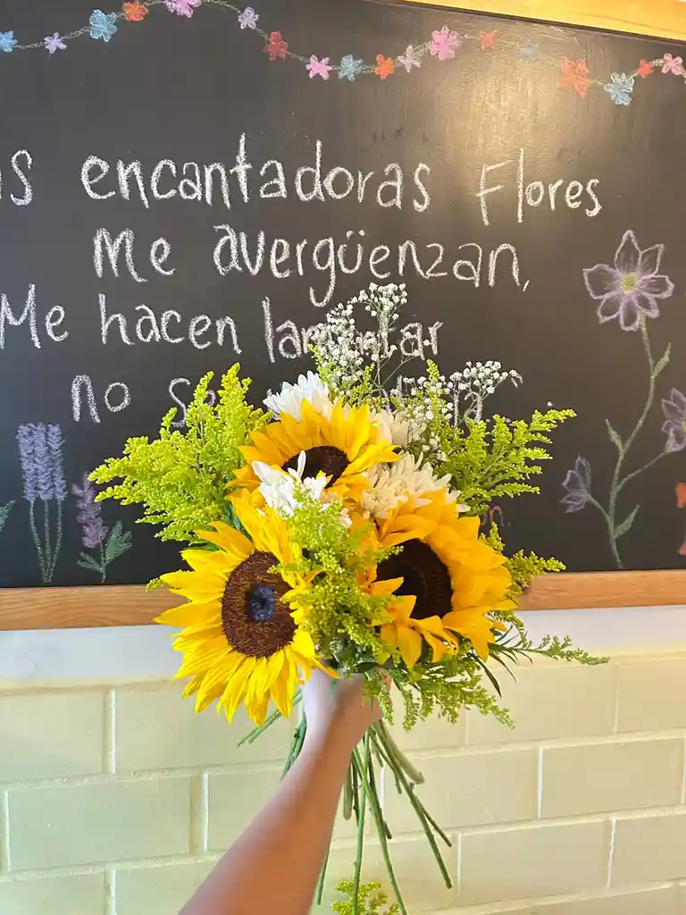Hermoso ramo con 3 girasoles, margarita y follaje. (incluye papel)