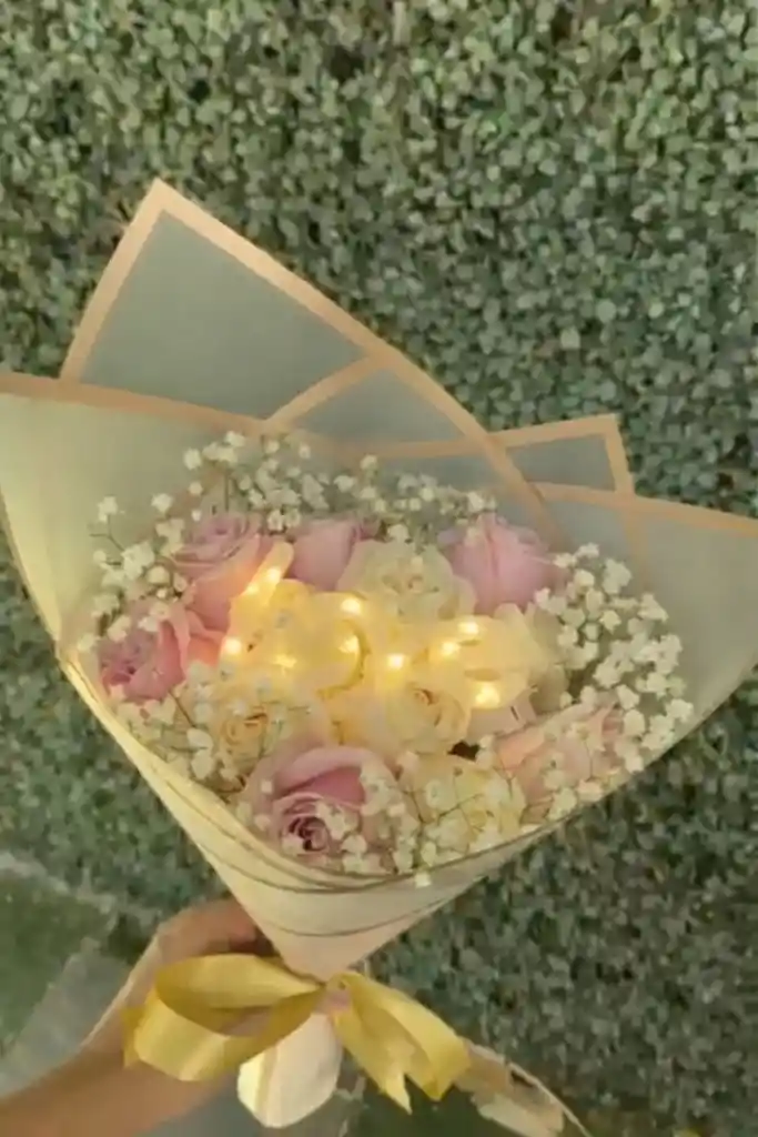 Elegante bouquet de rosas rosadas y blancas decorado con luces LED y letrero LOVE. Un detalle romántico y brillante para sorprender. 🌸✨