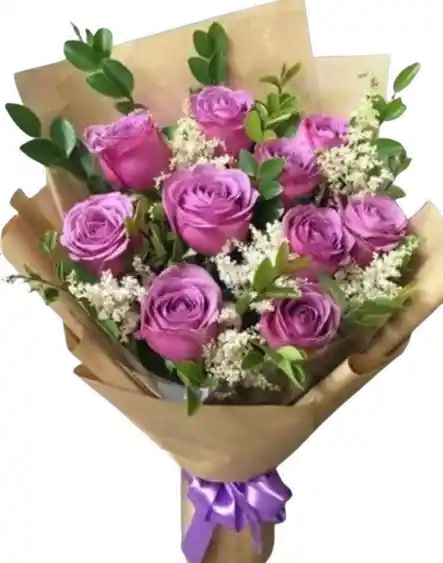 Un bouquet encantador compuesto por rosas lavanda de pétalos suaves acompañadas de finos acentos blancos y follaje fresco que aporta textura y equilibrio. Envuelto en papel kraft de estilo natural y finalizado con un lazo satinado lila, este diseño destaca por su elegancia moderna y su aire delicado. Perfecto para aniversarios, agradecimientos, detalles románticos o para sorprender con un regalo sofisticado y diferente. Su tono lavanda transmite serenidad, encanto y distinción, convirtiéndolo en un arreglo ideal para quienes buscan algo único y memorable.