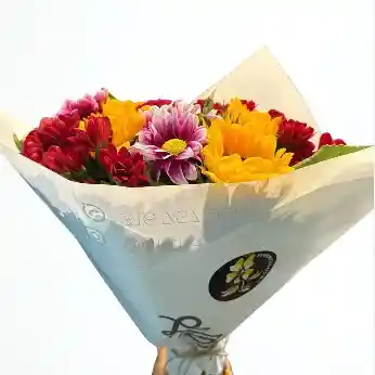 Mix de 10 varas de margartitas de varios colores y 3 girasoles mini Nota: La flor puede ser sustituida dependiendo la disponibilidad de color y del producto “Mensaje Personalizado” máximo de 30 caracteres (Dejar el mensaje en el chat, los comentarios no se previsualizan para la tienda por lo que si se dejan allí no podrá ser incluido).