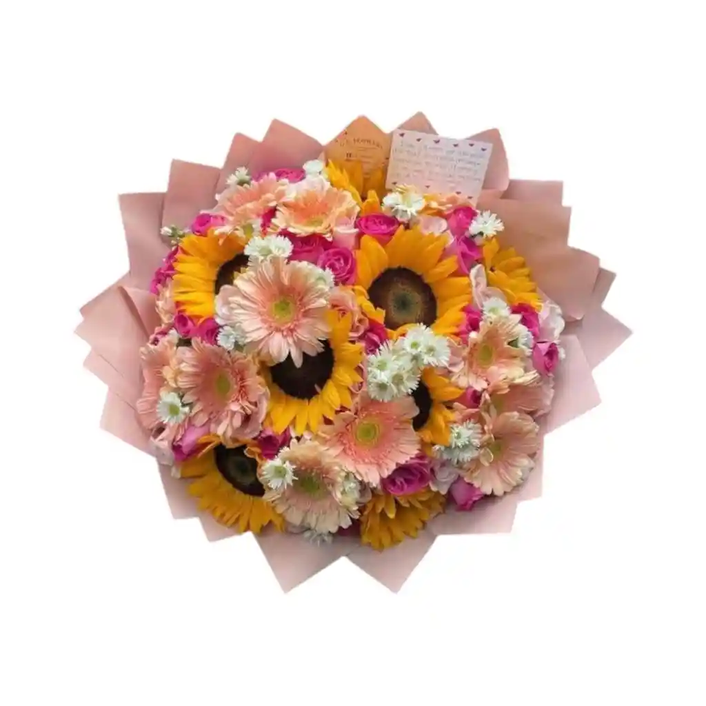 Bouquet elaborado con gerberas , girasoles , aster , rosas , envuelto en papel coreano