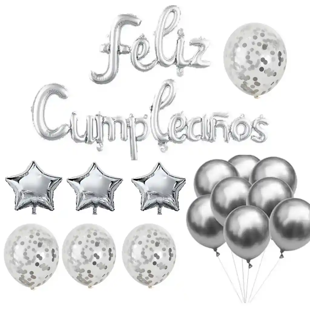 Bouquet feliz cumpleaños plateado 1 letrero feliz cumpleaños 3 globos estrellas 4 globos confeti 8 globos lisos