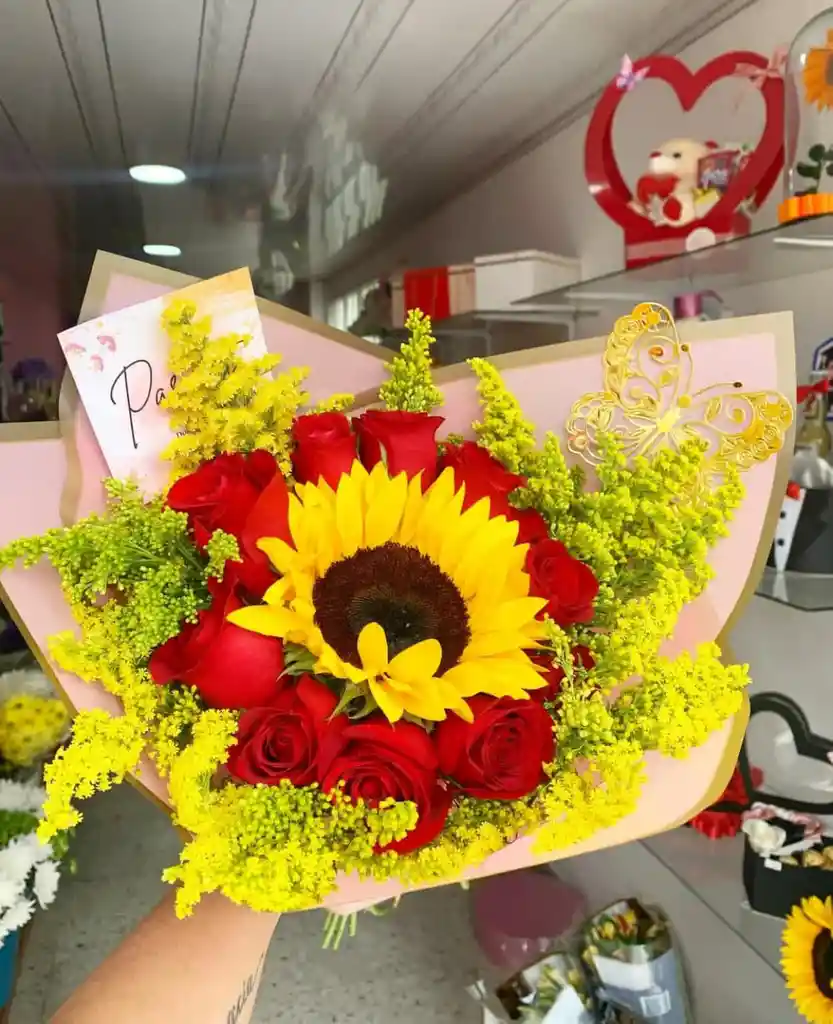 bouquet con 1 girasol al centro y borde de rosas follaje , papel coreano , mariposa decorativa , lazo y tarjeta