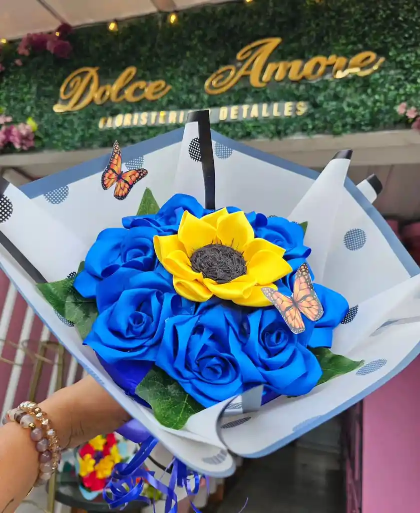 bouquet de girasol y rosas eternas hechas en cinta