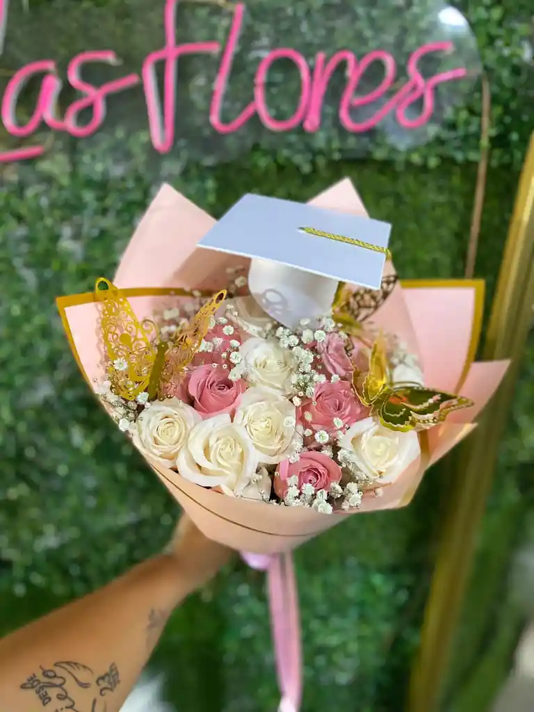 rosas blancas y rosada follaje papel de lujo mariposas birrete sujeto a disponibilidad