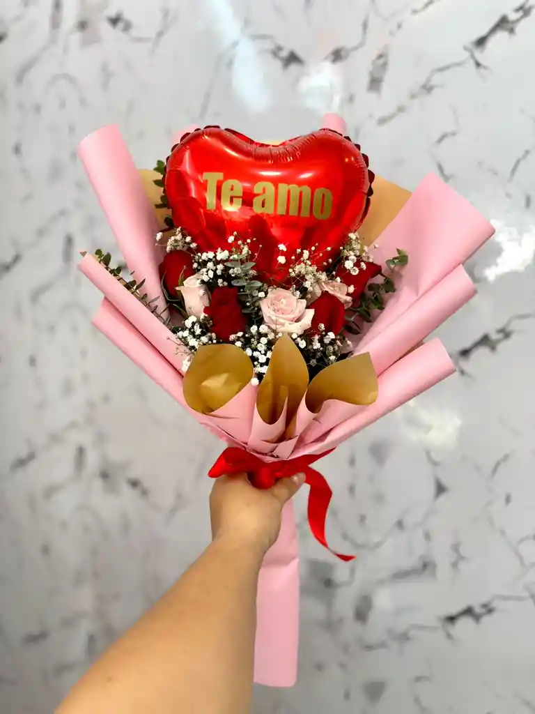 Rosas rojas y rosadas con delicado relleno floral y globo corazón “Te amo”. Perfecto para decirlo todo sin palabras. El color de la rosa y el papel puede variar según disponibilidad. Si deseas nota agregar por medio de mensajes, de lo contrario no se enviara.