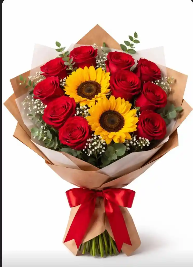 Bouquet de 12 rosas rojas 2 girasoles y follaje verde. perfecto para el romanticismo La mejor expresión de amor
