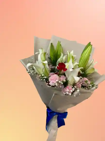 bouquet en lirios decoracion en papel koreano , moñito , mariposas, domicilio, tarjeta personalizada