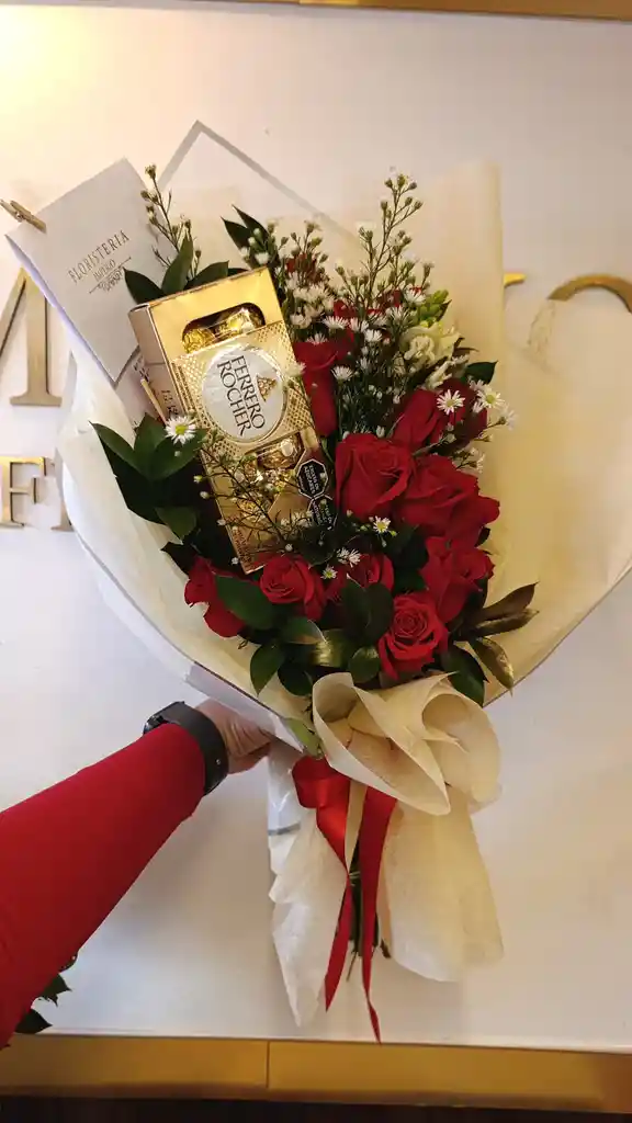 10 rosas rojas, rusco, 1 gipsofilia, ater blanco, ferrero rocher x8 y mensaje personalizado