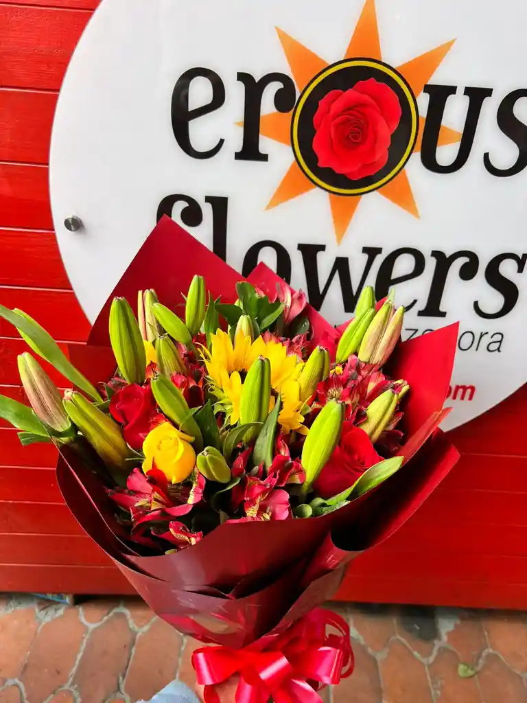 Ramo con girasol, lirios, rosa roja, rosa amarilla y astromelia, envuelto en papel coreano y moño decorativo. 🌻💐