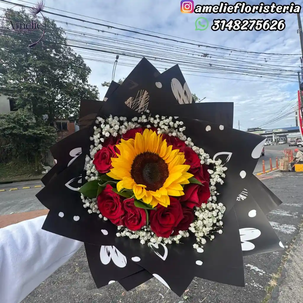 Bouquet de Girasol, Rosas, Gypsophila, follaje y decoración. / Indicar personalización el arreglo floral (colores y mensaje de la tarjeta) WhatsApp 3148275626