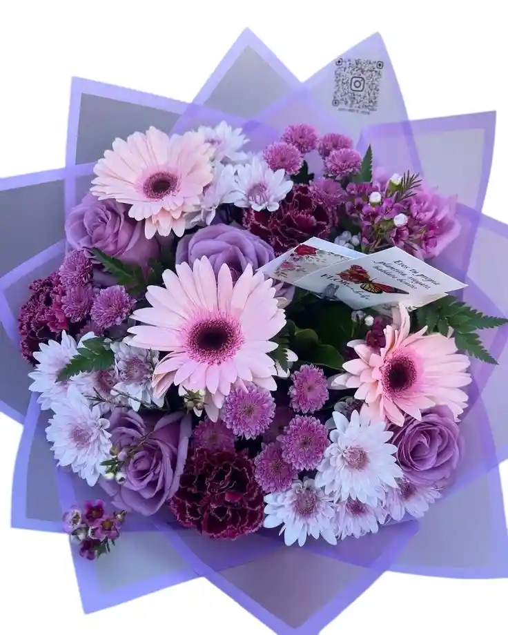 Hermoso bouquet con flores moradas, que contiene claveles, margaritas, rosas y pompones, ideal para regalar a esa persona especial