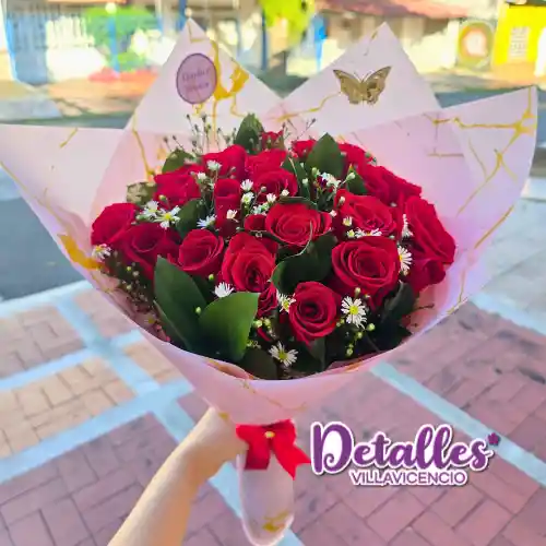 Ramo de flores redondo con rosas rojas, follajes, decorado con papel coreano y moños