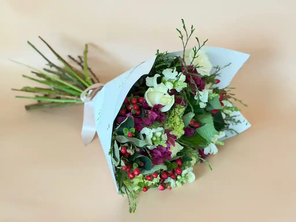 Hermoso bouquet navidad, que trae rosas blancas, hiperico, pino, mini hortensias, entre otras flores... puede variar según la disponibilidad de la cosecha folral.