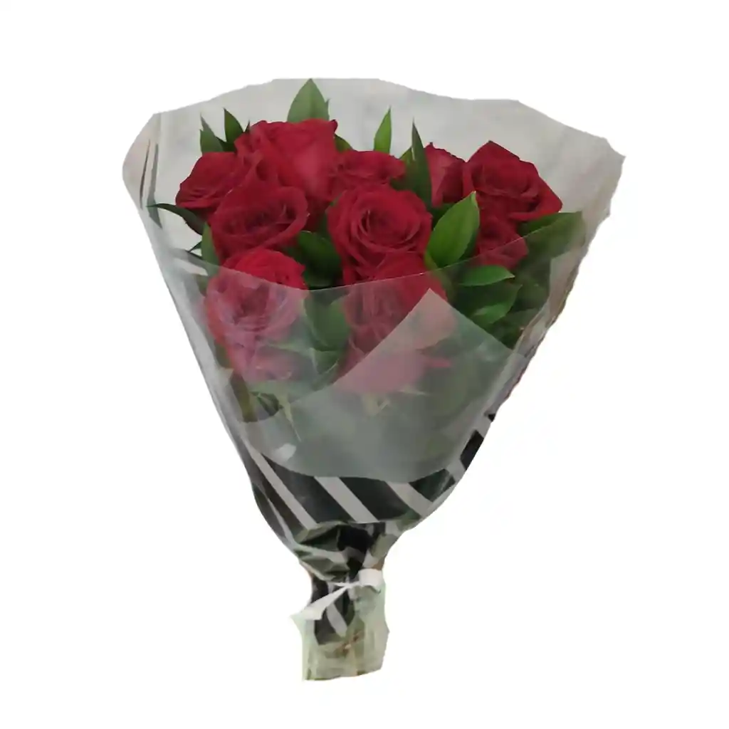 Hermoso bouquet de 10 rosas rojas, con follaje, perfecto para toda ocasión.