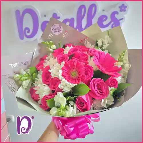 Ramo de mano redondo con rosas (el tono puede variar según disponibilidad) , flores tropicales en tonos cálidos, follajes, toque de gerberas o chirosas, papel coreano doble tono y moño grande