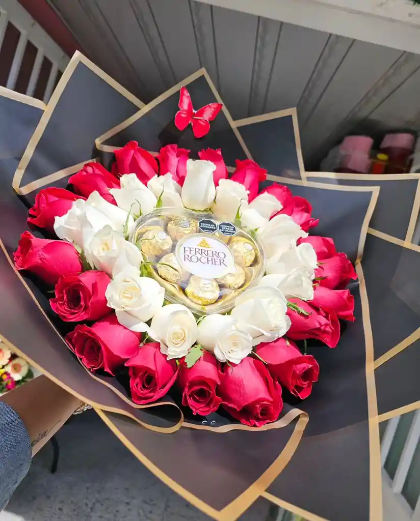 bouquet con un estuche de chocolates ferreros en forma de corazon con 2 bordes de rosas