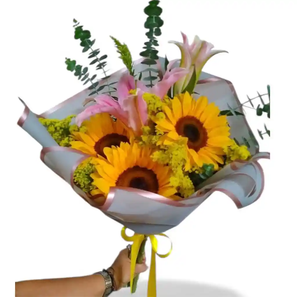 Ramillete de girasoles con lirios , eucalipto , soliaster envuelto en papel coreano