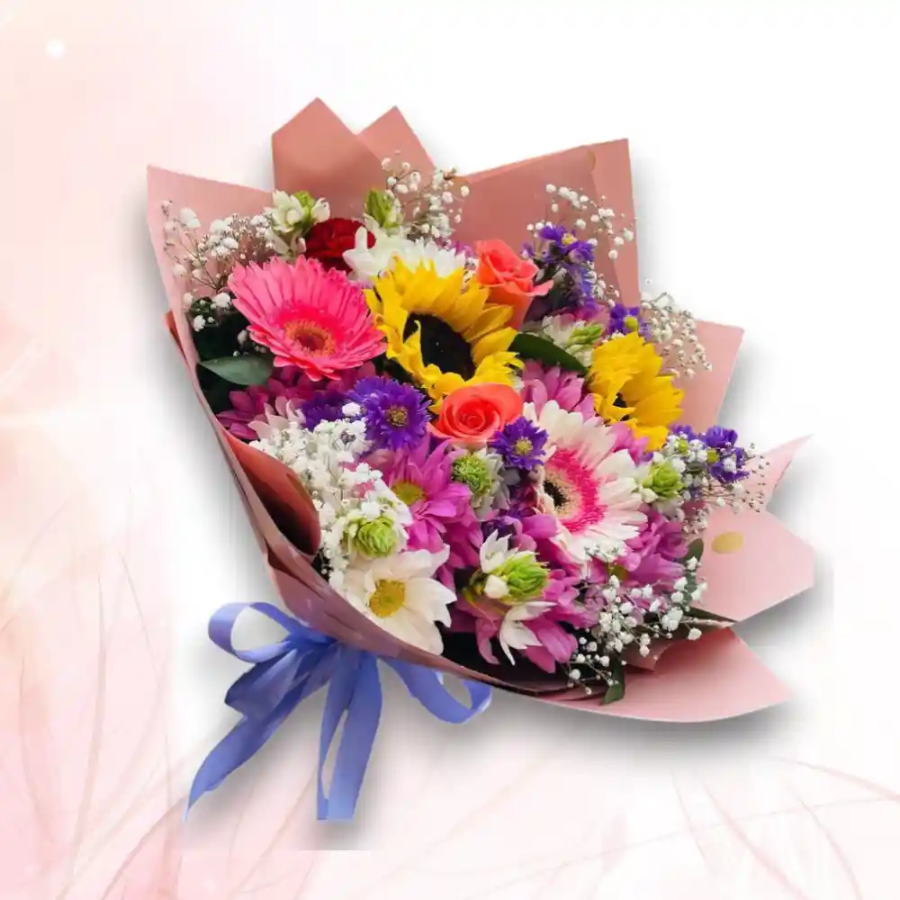 Llena el día de color y alegría con este espectacular bouquet de flores mixtas. Una combinación fresca y vibrante que incluye girasoles, gerberas, margaritas y flores complementarias, cuidadosamente seleccionadas para crear un arreglo armonioso y lleno de vida.