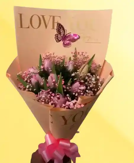 arreglo floral tipo ramillete en tulipanes tono rosado, decoracion en papel koreano, moño, mariposas, tarjeta personalizada, domicilio
