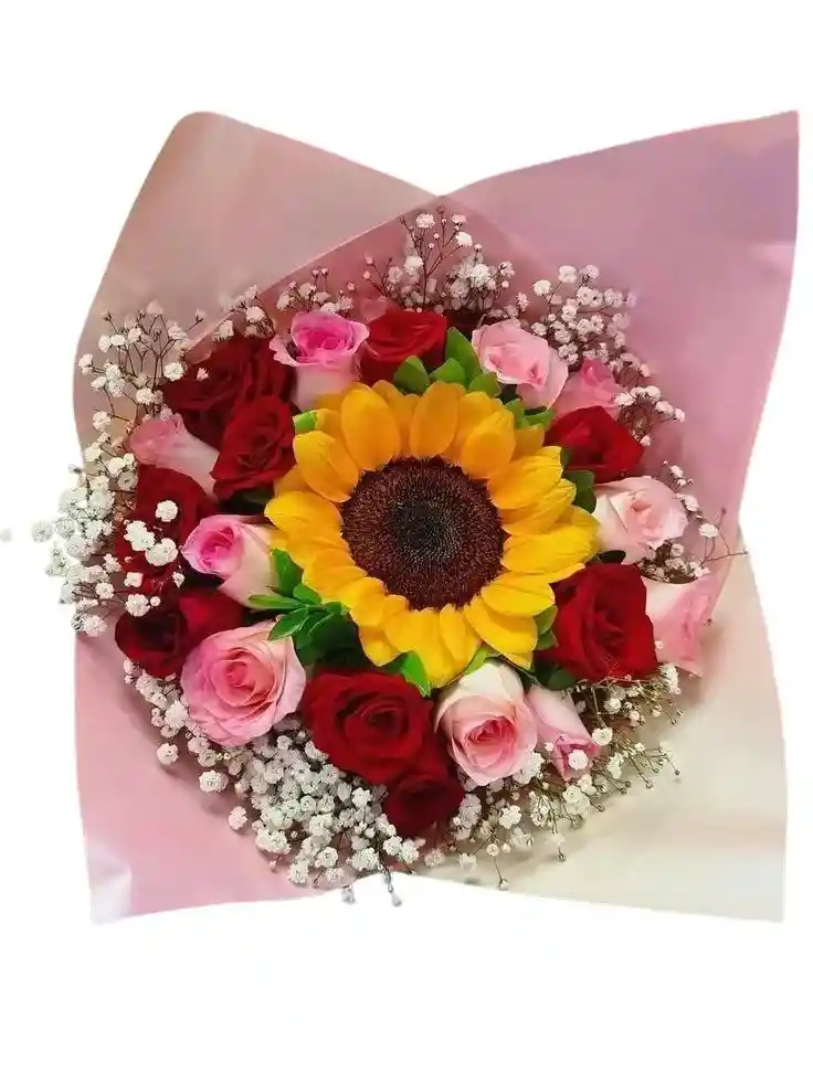 Bouquet de 20 rosas rosadas y rojas con1 girasol y gypsophila Nota: La flor puede ser sustituida dependiendo la disponibilidad de color y del producto “Mensaje Personalizado” máximo de 30 caracteres (Dejar el mensaje en el chat, los comentarios no se previsualizan para la tienda por lo que si se dejan allí no podrá ser incluido).