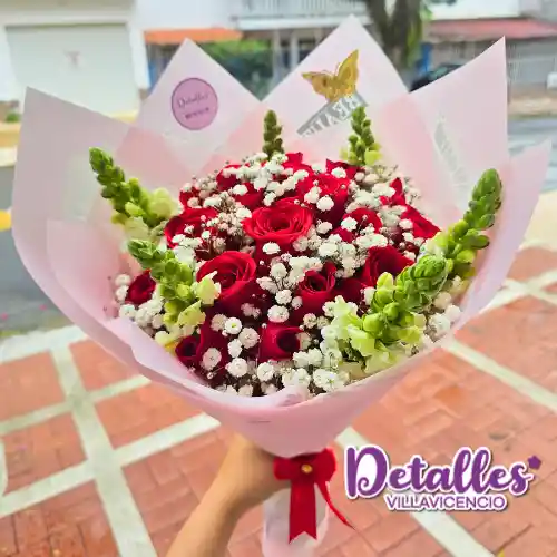 Ramo de flores redondo con rosas rojas, follajes, decorado con papel coreano y moños