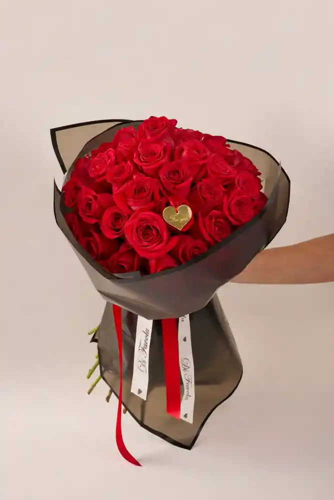Bouquet ref. Mazzo x 24 rosas tradicionales de exportación . Papel importado koreano negro En dia San Valentín color de rosas sujetas a disponibilidad por alta demanda.