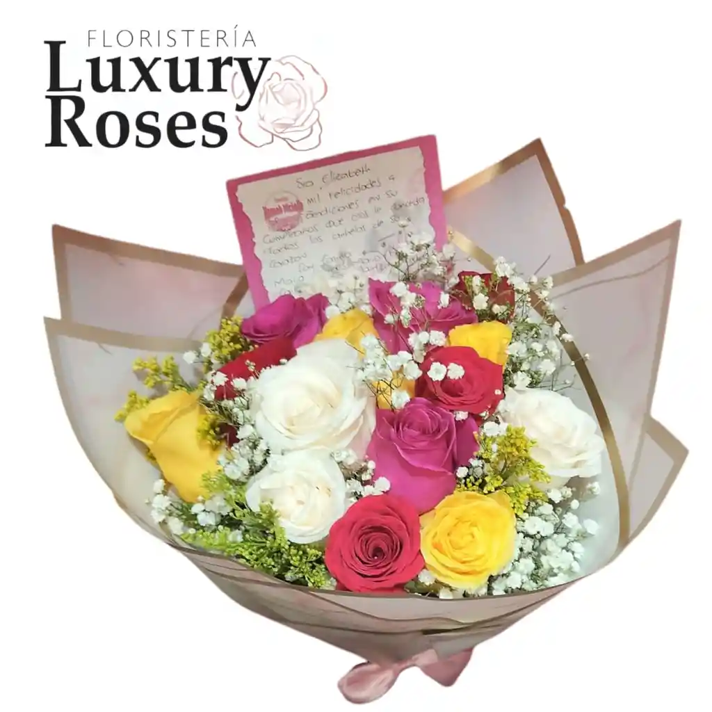 BOUQUETH DE 12 ROSAS COLORES, CON FOLLAJE GYPSO ASTER Y PAPEL DECORATIVO KOREANO , (SI DESEAS INCLUIR ALGUN MENSAJE PERSONALIZADO, MAXIMO DE 30 CARACTERES POR FAVOR ESCRIBIRLO EN EL CHAT, CON EL RAPITENDERO . EN LOS COMENTARIOS NO SE PREVISUALIZAN PARA LA TIENDA POR LO QUE SI DEJAN ALLI NO SE PODRA SER INCLUIDO)