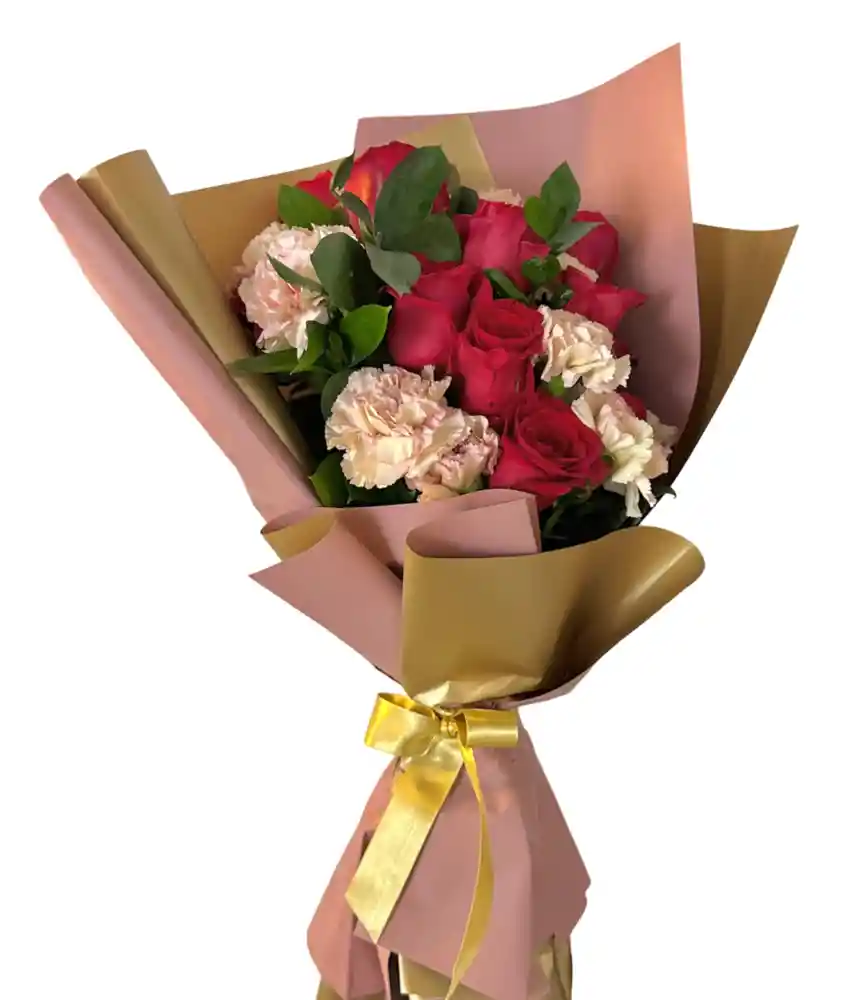 Hermoso bouquet Mediano »Georgia» incluye follaje, claveles, y rosas ! En papel coreano de lujo