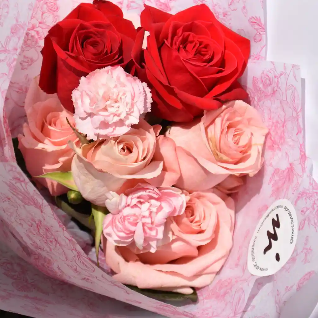 Bouquet ideal para detalles, con rosas rosadas, rosas rojas y un toque de clavelina, envuelto en papel de regalo. (Escribir en el chat el mensaje para la tarjeta) Incluye aprox.12–13 tallos.